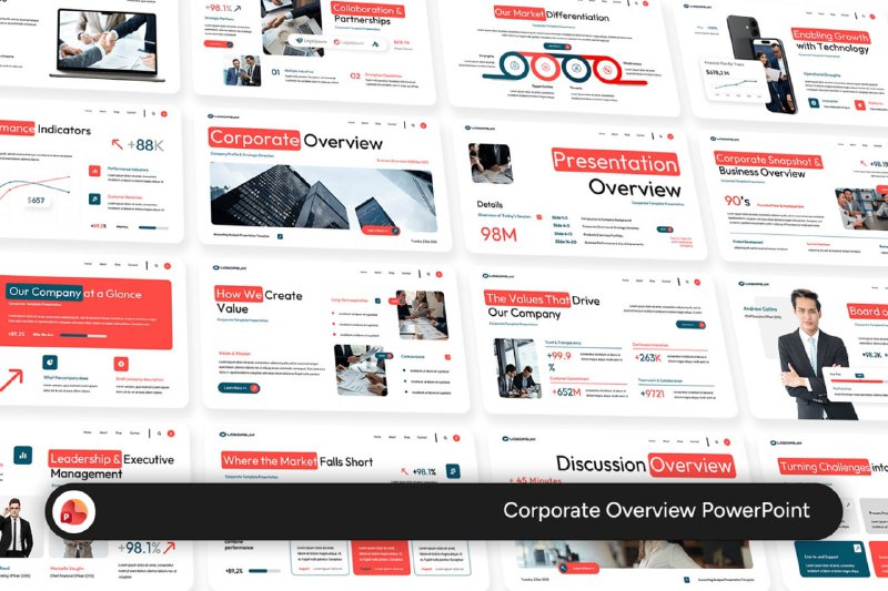 Профессиональный шаблон для корпоративных презентаций! 🤑 Круто сделаны красные и синие акценты на чистых белых страницах. Есть слайды с показателями эффективности и анализом рынка. #набор