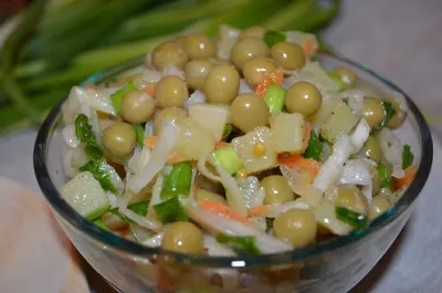 🥗 Салат с квашеной капустой и горошком 📝 Ингредиенты: Картофель (крупный) - 2 шт Капуста квашеная - 100 гр Консервированный зелёный горошек - 4 ст.л Зелёный лук - 1 небольшой пучок (или 1 репчатый