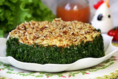 🥗 Салат "Медвежья шубка" с копчёной курицей 📝 Ингредиенты: Курица копчёная без костей - 300 гр Яйца - 3 шт Морковь - 1 шт Сыр твёрдых сортов - 70 гр Грецкие орехи очищенные - 50 гр Зелень свежая (у
