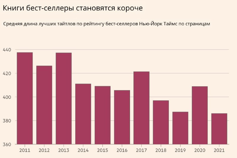 Книги бест-селлеры становятся короче. Мы становимся тупее или эффективнее? Тут явно возможна двоякая интерпретация. Однако, даже если мы предположим оптимистичную, это, скорее всего, говорит две в