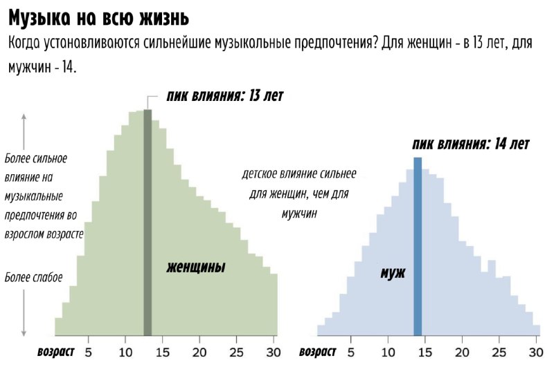 Нашёл вот такой интересный график и сильно удивился. Музыка, которую средний человек слушает в 13-14 лет, становится основанием для музыкальных предпочтений... на всю жизнь? Есть ощущение, что это с