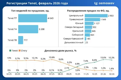 8 628 новых а/м Tenet встало на учет в феврале 2026, это -3,7% к январю по данным Олега Мосеева. 10,2% - доля бренда на рынке 🇷🇺 1️⃣ 4 643 а/м - Tenet T7; 2️⃣ 3 208 а/м - Tenet T4 3️⃣ 777 а/м - Ten