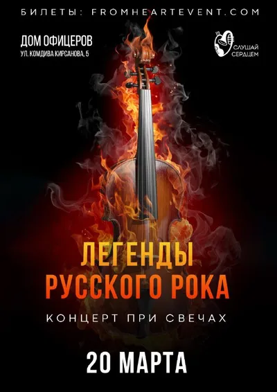 🔥 Легенды русского рока на виолончелях при свечах — 20 марта в рамках гастролей артистов из Санкт Петербурга! Главные песни русского рока в новом звучании. Виолончели, ударные, темнота зала и свет с