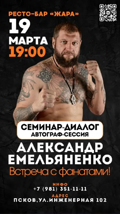 19 марта | четверг | 19.00 В Пскове состоится встреча с известным российским бойцом смешанных единоборств — Александром Емельяненко🥊 Александр — один из самых известных бойцов ММА из России, выступ