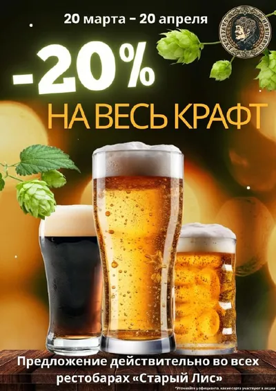 –20% НА ВСЁ 🍻? ДА, ВЫ НЕ ОСЛЫШАЛИСЬ!😉 В «Старом Лисе» уже в эту пятницу начинается жаркая акция от собственной пивоварни «Савицкий и сыновья»! 🔥 🍻 –20% на КАЖДЫЙ бокал крафта! Да-да, на каждый.