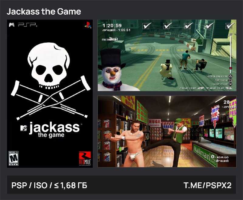 🟩 Jackass the Game Jackass the Game для PSP — это экстремальная игра, основанная на популярном американском телешоу «Jackass» (с англ. «Чудаки»), известном своими безрассудными и часто опасными трюк