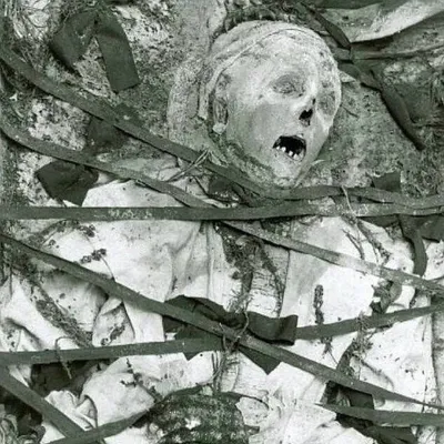 На фотографии мумия Анны Марии фон Штокхаузен. После смерти она была привязана, чтобы не могла сбежать из могилы. Согласно местному фольклору её казнили шесть раз за колдовство, но она воставала из мё