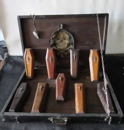Коммивояжерский портфель ритуального агента итальянского похоронного бюро. Внутри - мини-модели предлагаемых гробов и каталоги надгробных сооружений. Начало XX века.
