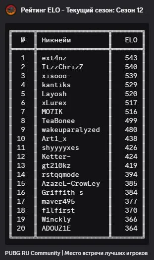 Завершился 12й игровой сезон, и вот его рейтинг по нашей системе ELO: 1️⃣ ext4nz - 100 USDT 💵 2️⃣ ItzzChrizZ - 50 USDT 💵 3️⃣ xisooo- - 30 USDT 💵 4️⃣ kantiks - 20 USDT 💵 5️⃣ Layosh - 10 USDT 💵