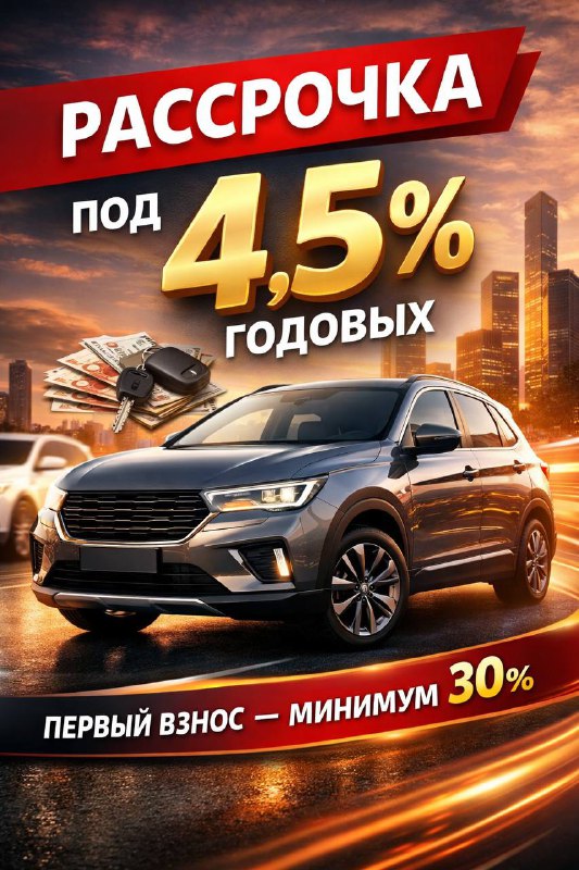 🚗 Время покупать автомобиль выгодно! Оформите авто в рассрочку всего под 4,5% годовых и станьте владельцем уже сегодня. ✔ Минимальный первый взнос — всего 30% ✔ Прозрачные условия ✔ Быстрое одобрен