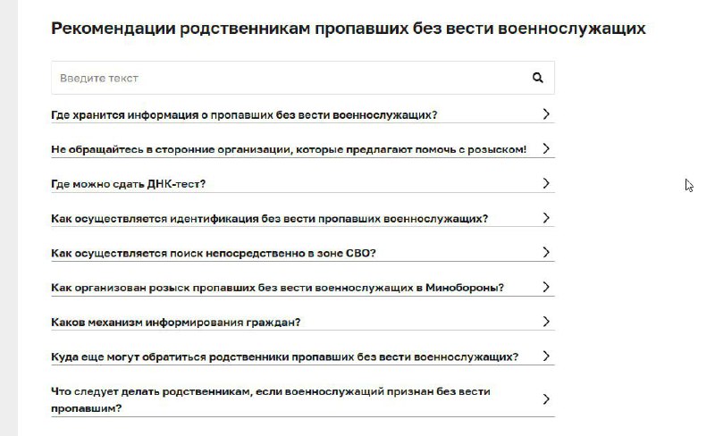 https://mil.ru/electronic_reception/rozysk-propavshih Рекомендации родственникам пропавших без вести военнослужащих. От Министерства обороны. ------------------------------------------ Подписывай