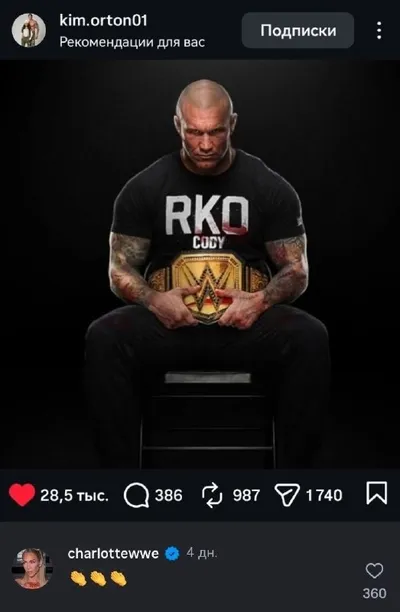 Жена Ренди Ортона в Instagram выложила фото мужа с Неоспоримым чемпионством WWE и в футболке "RKO Cody". Шарлотт Флэр в комментариях отправила три эмодзи с аплодисментами. Недавно Булли Рэй и некотор