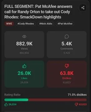 За первые 12 часов видео, в котором Пэт Макафи предстает в роли таинственного собеседника Ренди Ортона, набрало более 63 тысячи дизлайков на YouTube. Это уже второе по количеству дизлайков видео WWE в