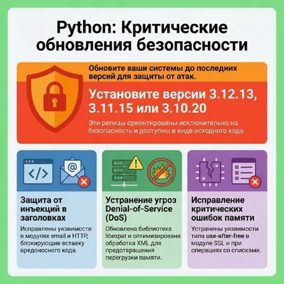 🛡 Срочное обновление безопасности: Python 3.12.13, 3.11.15 и 3.10.20 Если ваш проект работает на одной из этих версий Python, пришло время обновиться. Команда core-разработчиков выпустила экстренные