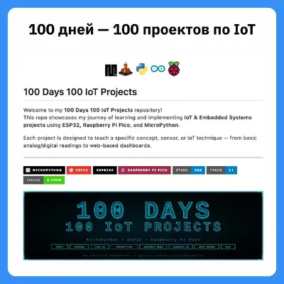 ⚡️ 100 дней IoT: для питонистов Этот репозиторий — пошаговый план трансформации из «программиста интерфейсов» в инженера встроенных систем. Автор использует MicroPython, ESP32 и Raspberry Pi Pico,