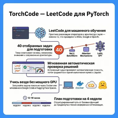🔥 TorchCode — LeetCode для PyTorch TorchCode — интерактивная среда (в Jupyter), где ты решаешь задачи по PyTorch, как на алгоритмических платформах. 40+ задач — от базовых до продвинутых 🔗 Ссылка