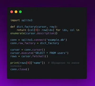 Получаем все строки как словари При работе с SQLite результат запроса по умолчанию возвращается в виде кортежей. Это не очень удобно, особенно если нужно обращаться к значениям по названиям колонок.