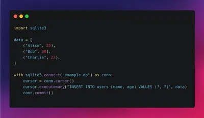 Массовая вставка данных без цикла Вставлять много записей по одной — неэффективно. Лучше использовать метод executemany, который сразу выполнит множество вставок за один запрос. 🎯 Итог executemany