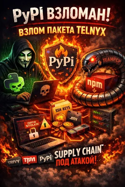 🚨 PyPI снова взломали. Теперь под ударом пакет telnyx Очередной удар по supply chain от TeamPCP. И это уже не единичный случай - это целая атака по экосистеме разработчиков. Что произошло: • Попул