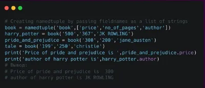 Альтернативный способ создания namedtuple В качестве альтернативы вы можете передать список, состоящий из имен полей, вместо просто имен полей, разделенных пробелом. Доступ к элементам в namedtuple