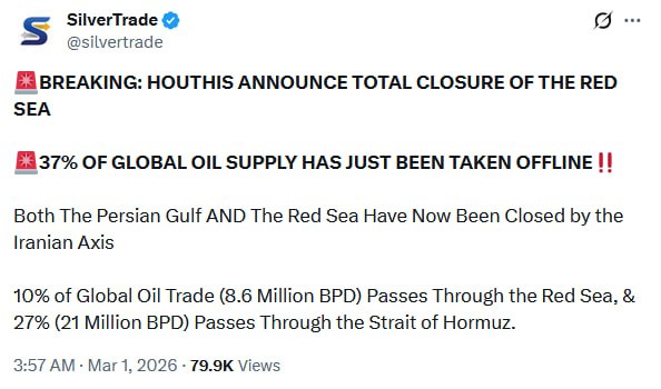 ✅🚨BREAKING: Хуситы объявили о полном закрытии Красного моря 🚨37% мировых поставок нефти только что выведены из оборота‼️ И Персидский залив, и Красное море теперь закрыты иранской осью Через Крас