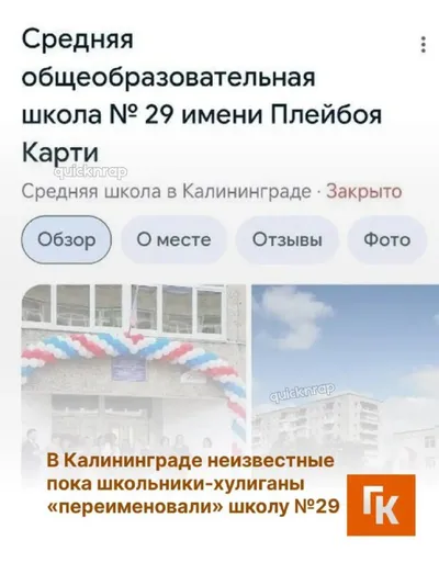 😭 Школа в честь Playboi Carti в Калининграде В Калининграде неизвестные школьники-хулиганы «переименовали» школу №29 в честь Playboi Carti. Кто-то из горожан заметил это в интернете и пожаловался