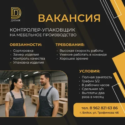 📢 Внимание, Бийск! Фабрика индивидуальной мебели «Дизаж» расширяет команду! Приглашаем на стабильную работу с честной оплатой. У нас найдется место и для опытного специалиста, и для того, кто готов