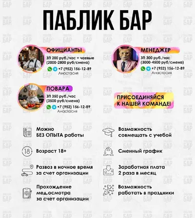 💬ПАБЛИК БАР ИЩЕТ СОТРУДНИКОВ В КОМАНДУ Открыты вакансии: • Официант • Повар • Менеджер Можно БЕЗ опыта — всему обучим. Условия работы: — Официанты: 200 ₽/час + личные чаевые (2000–2800 ₽ за смену)
