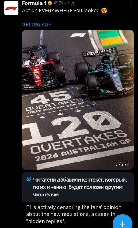 ‼️🏎 Формула-1 начала удалять негативные комментарии под постом о новом регламенте Пользователи заметили, что официальный аккаунт Формулы-1 активно чистит негативные комментарии под публикацией со ст