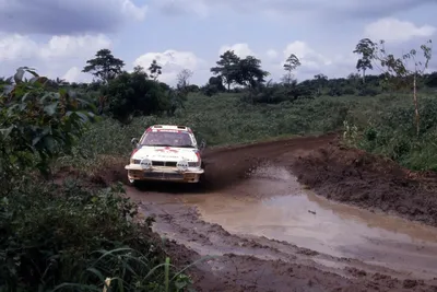 На этой картинке у нас ралли Кот-д'Ивуар 1992 года и пресловутый Кендзиро Синодзука в компании с Джоном Мидоузом, катящие этот свой Mitsubishi Galant VR-4 к своей второй кряду победе в этой гонке – по