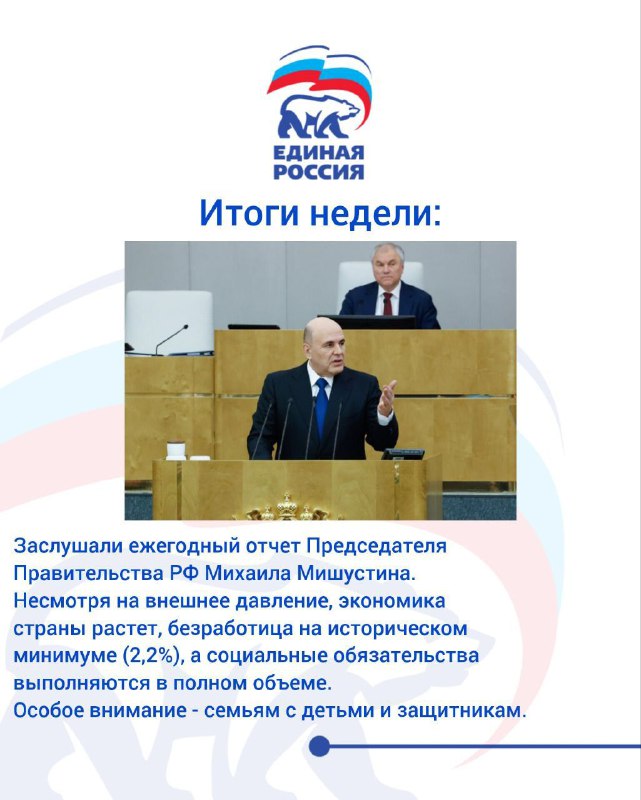Итоги недели: 🔹 Эта неделя в Госдуме была ознаменована важным событием. Заслушали ежегодный отчет Председателя Правительства РФ Михаила Мишустина. Несмотря на внешнее давление, экономика страны рас