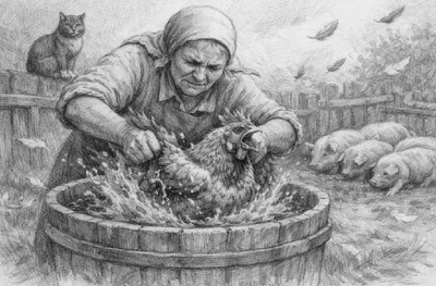 Прасковья Ивановна, ухватив за крылья большую пеструю курицу, сердито окунала ту в большую кадку с водой. Курица душераздирающе кричала и пыталась вырваться. Закончив купание, хозяйка сердито бросила