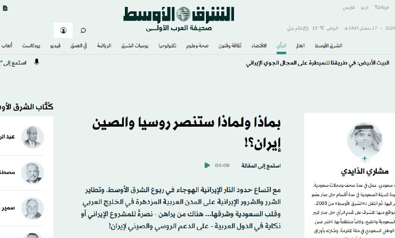 Asharq Al-Awsat: За спиной Ирана – медведь и дракон Россию и Китай связывают клятвы дружбы с Ираном, пишет издание, принадлежащее Саудовской Аравии: Пекин и Москва никоим образом не позволят Тегеран