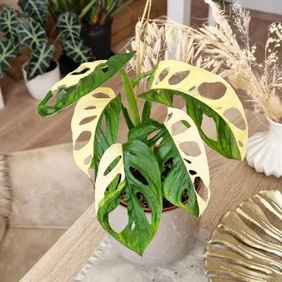 🍀 Monstera Adansonii Variegata - это разновидность растения Монстера, которая отличается красивым белым и зеленым окрасом листьев. Это растение стало очень популярным среди коллекционеров растений и