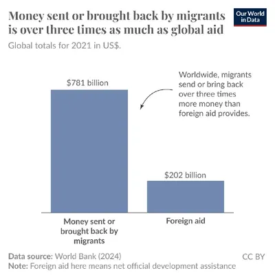 Сколько денег отправляют домой мигранты, 2022 (Our World in Data) Согласно оценке World Bank от 2024 года, в 2021 году мигранты по всему миру отправили или привезли домой суммарно 781 миллиард доллар