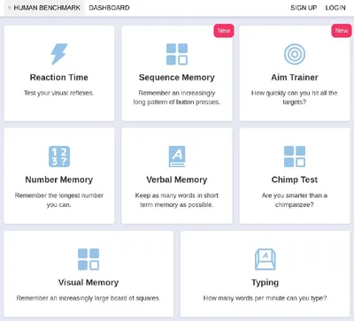 Human Benchmark — сайт, на котором можно проверить свою реакцию, различные виды памяти, меткость, скорость печати и умнее ли вы шипанзе. Свои результаты можно сравнить с результатами всех остальных по