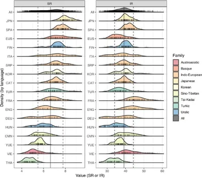 Соотношение скорости и информативности речи в языках мира (Flowing Data) На диаграмме слева — нормальное распределение показателей скорости речи (speech rate) в слогах в секунду. Справа — распределен