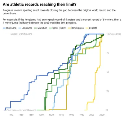 Как быстро ставились мировые спортивные рекорды в 6 дисциплинах, 1829–2024 (Julian Freyberg) Среди видов спорта: — прыжки в высоту — прыжки в длину — марафон — спринт (100 метров) — жим лёжа — станов