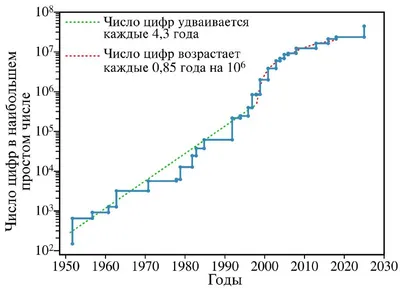 Наибольшее известное на данный момент простое число — 2¹³⁶²⁷⁹⁸⁴¹ − 1. Оно было найдено Люком Дюрантом в октябре 2024 года в рамках проекта распределённых вычислений GIMPS и состоит из 41 024 320 цифр.