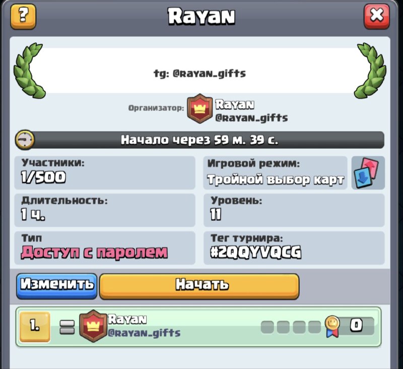⚡️ Турнир по Clash Royale от меня 🏆 1 место - троянский конь 🎁 🎁 2 место - новый мишка 🎁 3 место - новый мишка ⏱ Старт в 16:00 по мск Название: Rayan Пароль: rayan ➡️ Или можно вступить по сс