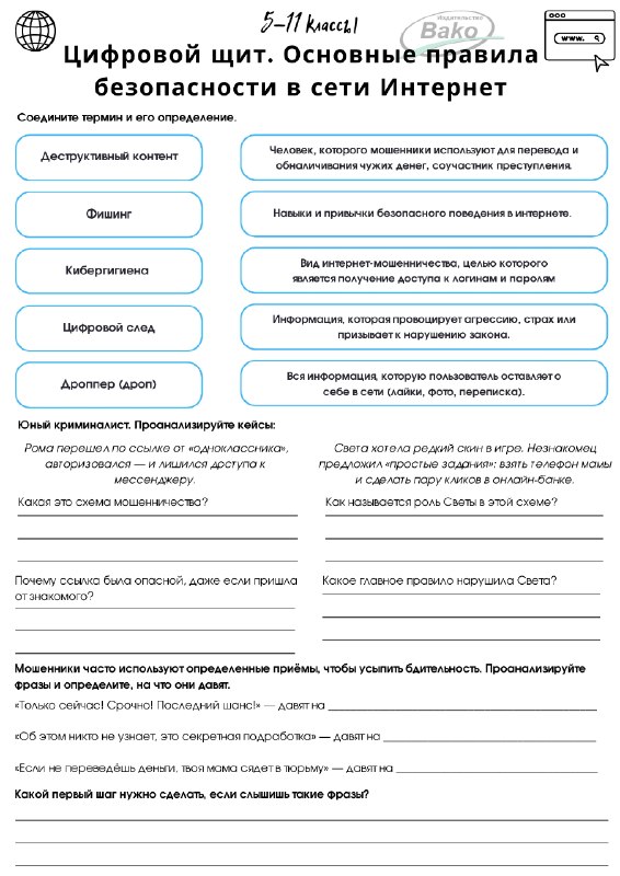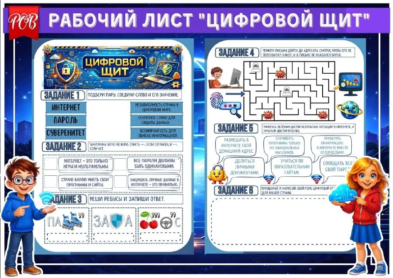 🆕 РАБОЧИЙ ЛИСТ «ЦИФРОВОЙ ЩИТ» Готовый материал для занятия «Разговоры о важном» по теме цифровой безопасности 💻 Интерактивные задания, ребусы, лабиринт и ситуации из жизни — всё, чтобы дети легко и