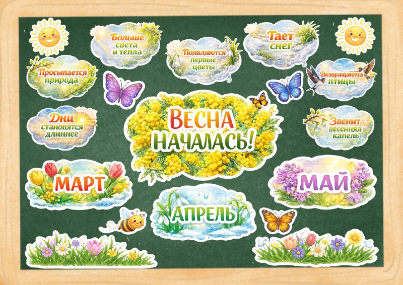 🌸 Вот и долгожданная весна! 🌿 Насыщенное и цельное оформление доски «Весна началась!» для начальной школы. В комплекте: 🌼 большое центральное облако 🌷 месяцы: март, апрель, май ☀ 7 тематических