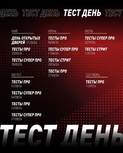 Сезон тест-дней 2026 стартует уже 1 мая! По традиции его начнет День открытых дверей — отличная возможность для всех желающих познакомиться с дрэг-рейсингом. Сохраняйте расписание тестов сезона 2026