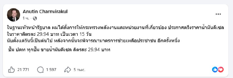Г-н Анутин выдал распоряжение «В качестве главы правительства я поручил Министерству энергетики и соответствующим ведомствам заморозить цены на дизельное топливо на уровне 29,94 бата за литр сроком н