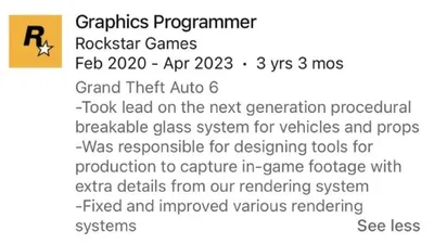 В GTA 6 может появиться система процедурного разрушения стёкол вместо заранее записанных анимаций, как в GTA V. Информацию нашли в профиле разработчика Rockstar Games на LinkedIn. 🧐Позже этот фра