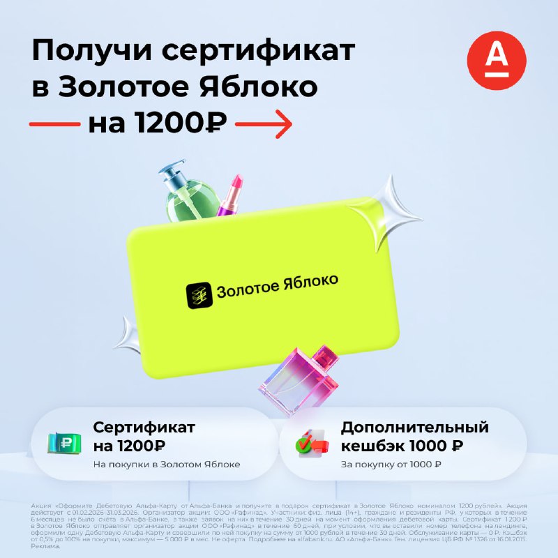 🏦Готовимся к шопинг-марафону с уникальным предложением от Альфа-Банка Только сейчас вы можете получить сертификат в Золотое Яблоко на 1200 Р Оформите дебетовую Альфа-Карту ➡️по ссылке и наслаждайт