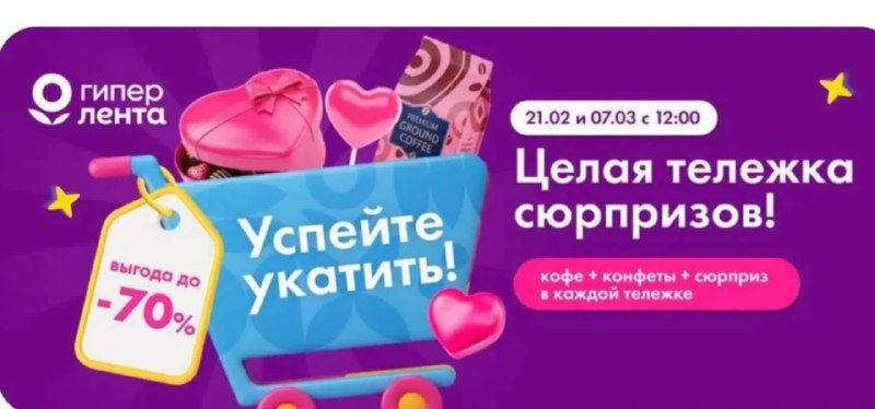 🌻Если вы любите сюрпризы, для вас отличная акция пройдет завтра! Тележки с подарками в Гипер Ленте, в каждой есть кофе и конфеты, а все остальное — сюрпри-из! Может быть и посуда, и бытовая техника,