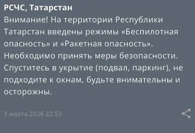 Режим ракетной опасности в Татарстане отменен - МЧС При этом сохраняется активным режим беспилотной опасности.