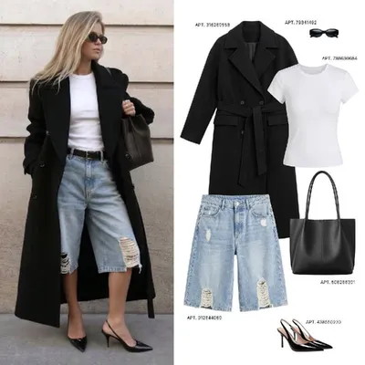 Образ для знака зодиака — Близнецы 🤍 Этот знак любит микс: комфорт + акцент. Топ в стиле скимс, оверсайз джинсовые шорты, пальто и каблуки — тот самый спортшик 🚩 Облегающая футболка Цвет: белый,