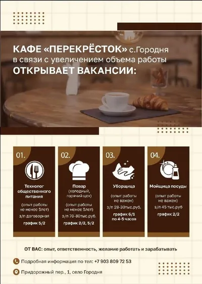 В кафе ПЕРЕКРЕСТОК с. Городня требуются ТЕХНОЛОГ, ПОВАР, УБОРЩИЦА, МОЙЩИЦА ПОСУДЫ !! Обращаться по телефону 8 (903) 809-72-53